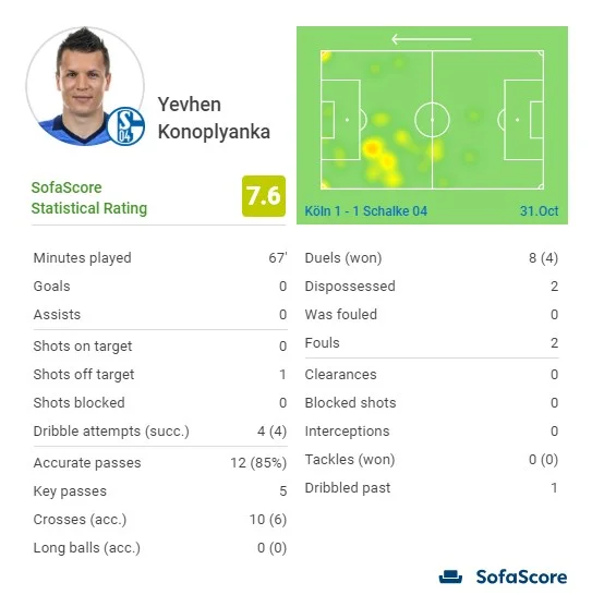 Свій єдиний гол "кнаппен" забили вже після того, як українець пішов з поля, однак такі показники посприяли тому, що Коноплянка отримав другу найкращу оцінку в складі Шальке від статистичного порталу SofaScore – 7.6. Лише активний Харіт і воротар Нюбель, який виграв серію пенальті, мають на одну десяту більше.