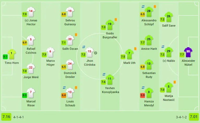 Доменіко Тедеско вкотре провів активну ротацію, за що його критикують у пресі, але схему на Кельн кардинально не змінював. Євген Коноплянка у своєму другому матчі поспіль зайняв позицію в нападі Шальке – поруч з Бургшталлєром. Судячи з тенденції останніх ігор, українець не готовий провести на полі увесь поєдинок. Його замінили в середині другого тайму.