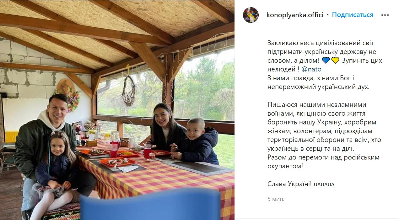 Закликаю весь цивілізований світ підтримати українську державу не словом, а ділом! НАТО, зупиніть цих нелюдей! З нами правда, з нами Бог і непереможний український дух. Пишаюся нашими незламними воїнами, які ціною свого життя боронять нашу Україну, хоробрими жінками, волонтерами, підрозділами територіальної оборони та всіма, хто українець в серці та на ділі. Разом до перемоги над російським окупантом! Слава Україні!" – написав Коноплянка в Instagram.
