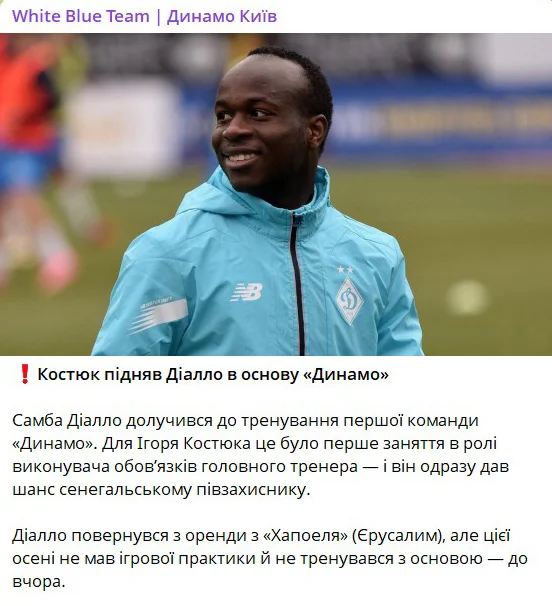 Виконувач обов'язків головного тренера Динамо Ігор Костюк повернув до складу першої команди сенегальського півзахисника Самбу Діалло, повідомляє Telegram-канал "White Blue Team".