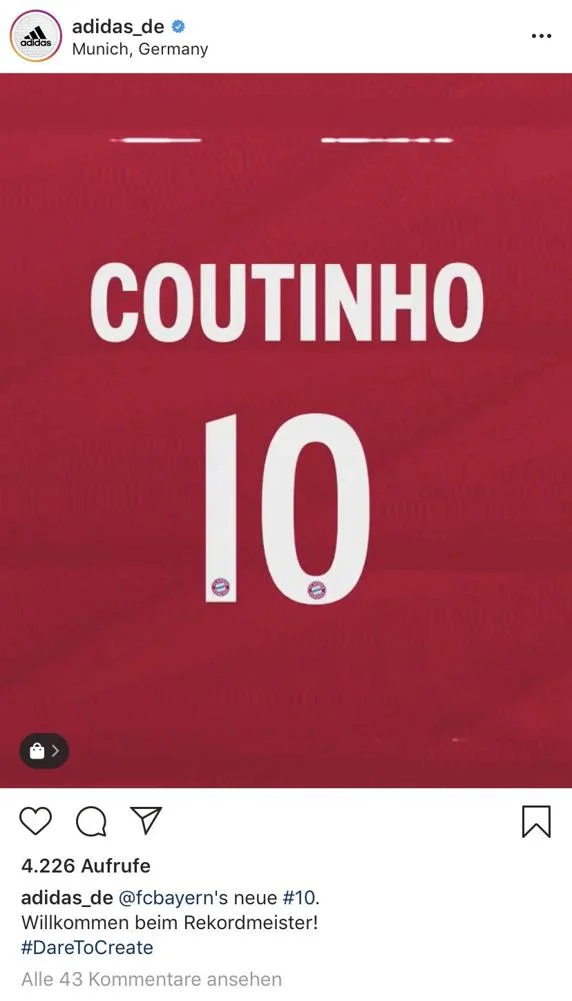 Технічний спонсор мюнхенців Adidas поспішно привітав німецький клуб з підписанням зіркового бразильця, оприлюднивши і його майбутній ігровий номер – 10. Пізніше цей допис було видалено.