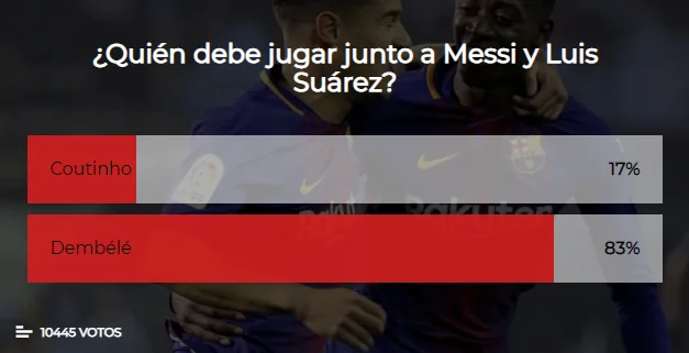 Дембеле, якого так критикували через регулярне порушення дисципліни, повністю затьмарив "чаклуна" з Ріо-де-Жанейро. Попросивши вибачення перед партнерами по команді, француз видав серію яскравих матчів та вважається зараз повноправним учасником нового тріденте поруч з Мессі і Суаресом. Усман демонструє набагато краще порозуміння з Лео, а також суттєво випереджає бразильця за індивідуальними показниками. У всіх турнірах прудконогий вінгер наколотив 10 голів та зробив 5 результативних передач. Натомість Коутінью може похвалитись 6-ма влучними пострілами та 4-ма аситами. Фанати Барси не сумніваються: на лівому фланзі атаки повинен грати Дембеле.