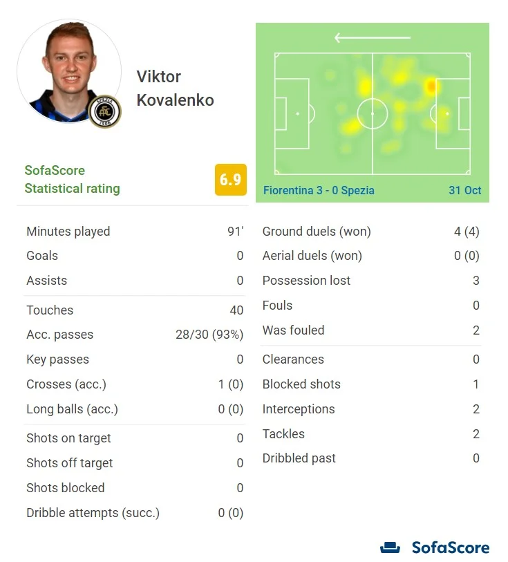 Віктор Коваленко став найкращий польовим гравцем Спеції в матчі. Оцінка від SofaScore – 6.9. Тільки воротар Проведель отримав більше. Статистика в українця дійсно непогана: 2 перехоплення, 2 відбирання, 1 заблокований удар, 100% виграних єдиноборств. Але варто зазначити, що статистичні портали не можуть врахувати позиційні помилки.