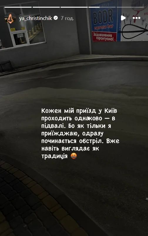 "Кожен мій приїзд у Київ проходить однаково – в підвалі. Бо як тільки я приїжджаю, одразу починається обстріл. Вже навіть виглядає як традиція", – написала Христина на своїй сторінці у соціальній мережі Instagram.