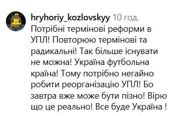 "Потрібні термінові реформи в УПЛ! Повторюю – термінові та радикальні! Так більше існувати не можна! Україна – футбольна країна! Тому потрібно негайно робити реорганізацію УПЛ! Бо завтра вже може бути пізно! Вірю, що це реально! Все буде Україна!" – написав Козловський у коментарях під публікацією Брутального футболу.