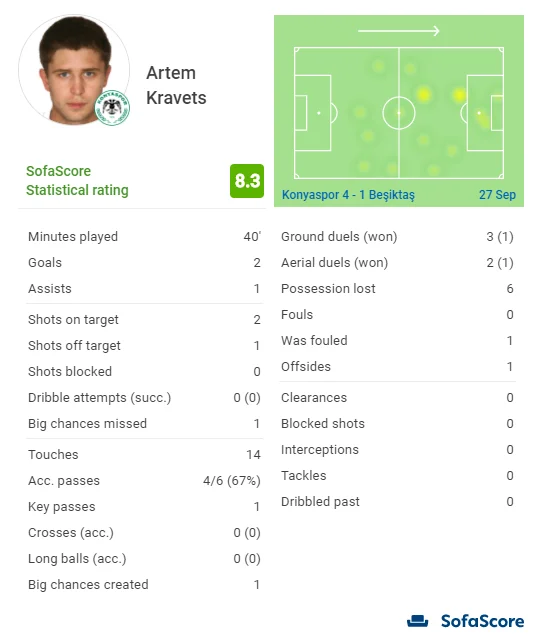 Це був день великого камбеку. У першому ж матчі після повернення в Туреччину Кравець розбив Бешикташ – красень-гол, реалізований пенальті та гольовий пас. І все це за 40 хвилин після виходу на поле. Артем отримав 2-й найкращий бал з версією SofaScore (8,3), FootballCritic (8,4), WhoScored (8,1) і FotMob (8,8). Тільки Волині (6 за 5 матчів) за всю свою кар'єру 31-річний бомбардир забивав частіше, ніж Бешикташу (4 за 8 ігор). Причому всі голи – у попередніх чотирьох поєдинках. Цікаво, що турецький гранд востаннє програв у Суперлізі, коли українець відзначився ще за Кайсеріспор.