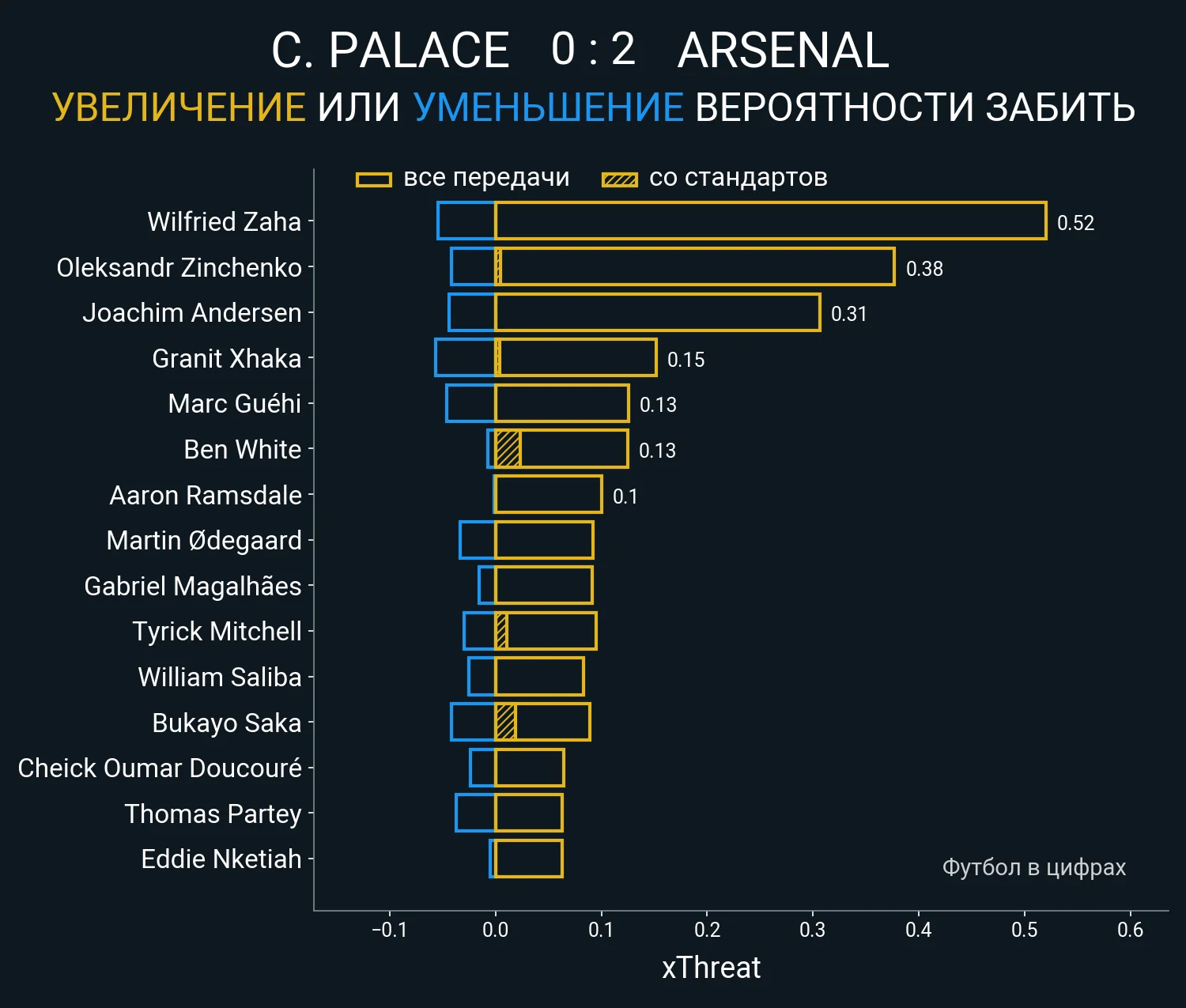 Крім того, Олександр видав 44 точних передачі з 56-ти (за іншими даними, 40 із 49-ти) – 4 пройшли з просуванням, 2 пішли під удар (лідер Арсенала), 1 стала гольовою. При цьому українець став другим футболістом на полі за сумарною гостротою передач (xT), а конкретно в складі "канонірів" він набив майже третину від загальнокомандного показника (0.38 із 1,26).