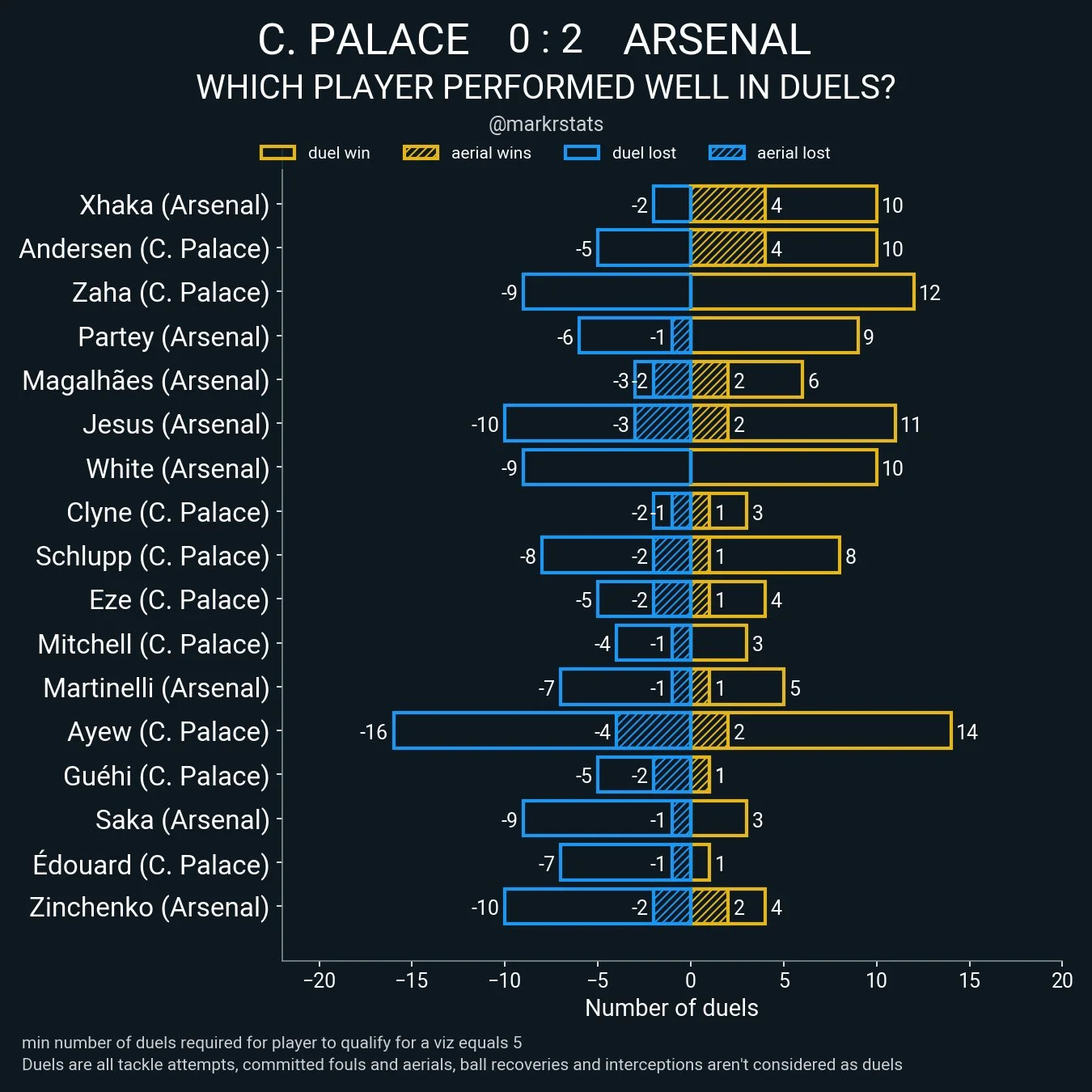 По-перше, лівому фулбеку північних лондонців важко давалася боротьба зі швидкими вінгерами "орлів". Українець програв 7 з 14-ти єдиноборств і тричі дозволив обіграти себе на дриблінгу. За кількістю дуелей (в них входять спроби відбирань, верхові єдиноборства, фоли, повернення м'яча та перехоплення, які не вилились у нову дуель), Сашко став найгіршим футболістом на полі.