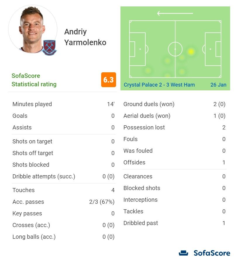 Андрій Ярмоленко на вихідних допоміг Вест Хему перемогти в Кубку Англії – він забив і віддав передгольову передачу, зігравши на позиції центрфорварда. Однак в АПЛ, де команда набрала хороший хід, тренерський штаб довіряє іншим виконавцям. На гру проти Крістал Пелас українець залишився в запасі, а групу атаки "молотобійців" сформували Боуен, Форнальс, Бенрама та Антоніо.