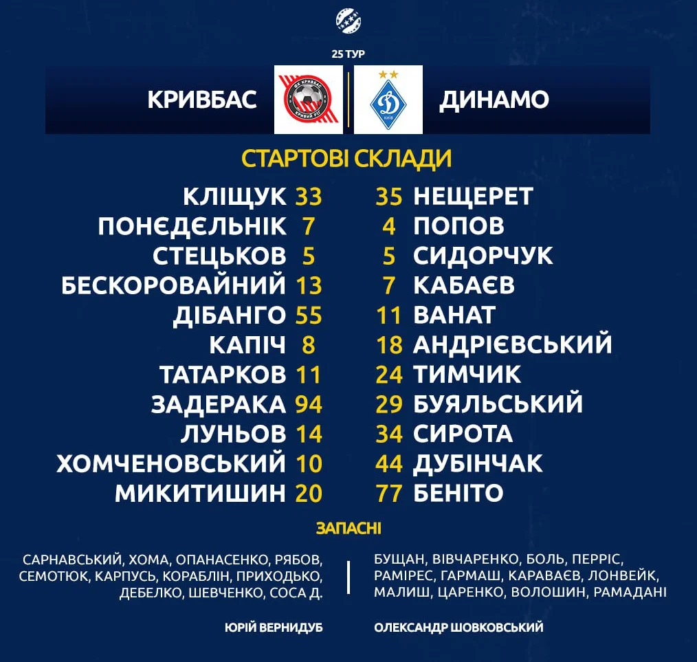 Кривбас і Динамо зустрічаються у 25-му турі чемпіонату України. Склади та посилання на онлайн-трансляцію поєдинку дивіться на "Футбол 24".