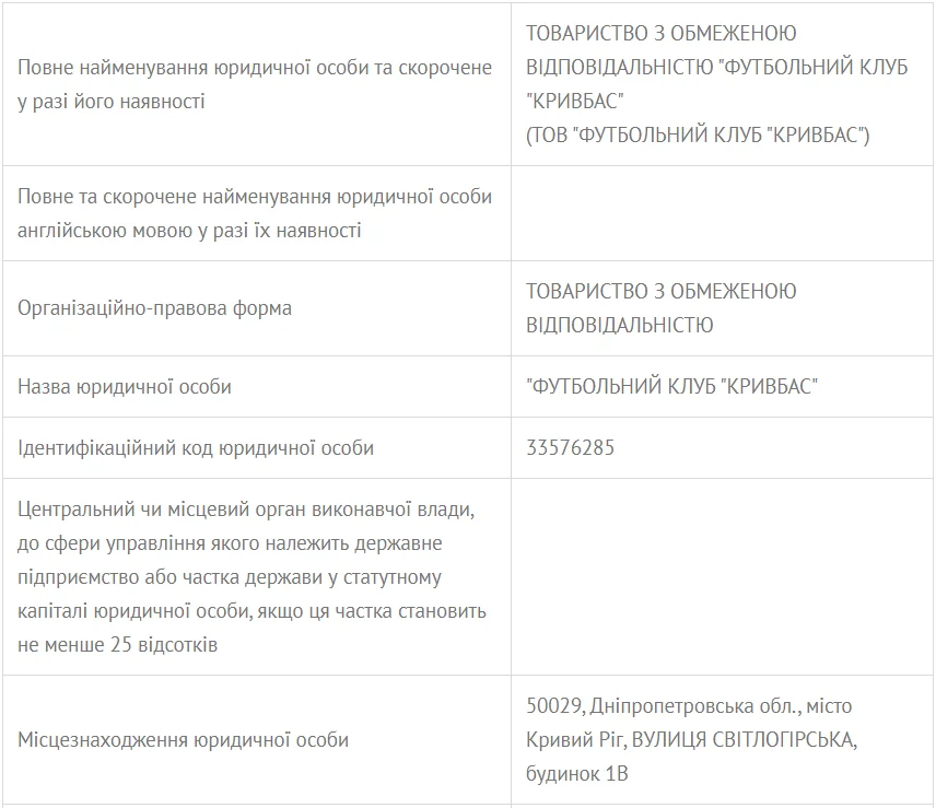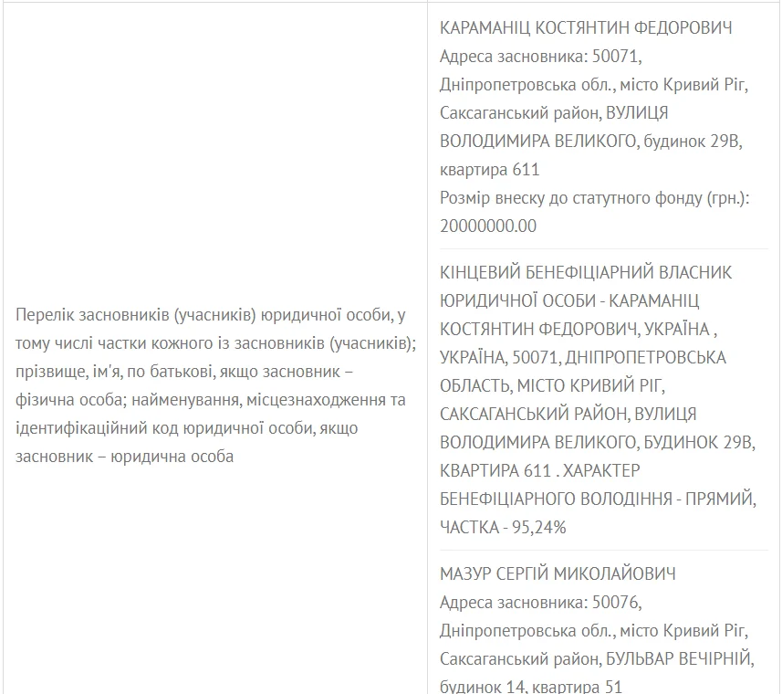 Відповідний запис з'явилася в державному реєстрі юридичних осіб. Засновником і кінцевим бенефіціарним власником вказано Костянтин Караманіц. Іншим співзасновником є колишній тренер Кривбасу Сергій Мазур. Статутний фонд – 20 млн гривень.