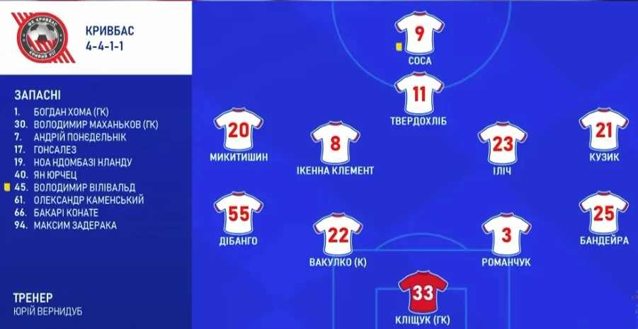 Також у лазареті донеччан залишився Конопля, а Криськів не потрапив до заявки (він тільки-но відновився під травми). Список втрат Кривбаса виявився не менш широким – взимку команду покинули Стецьков, Драмбаєв і Бізімана, які починали матч з Шахтарем в основі. Нині ж на лікарняний загриміли Хомченовський і Микитишин, а Мендоса й Аморозо покинули клуб через обстріли.