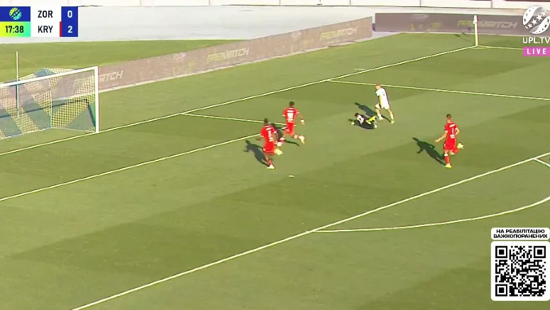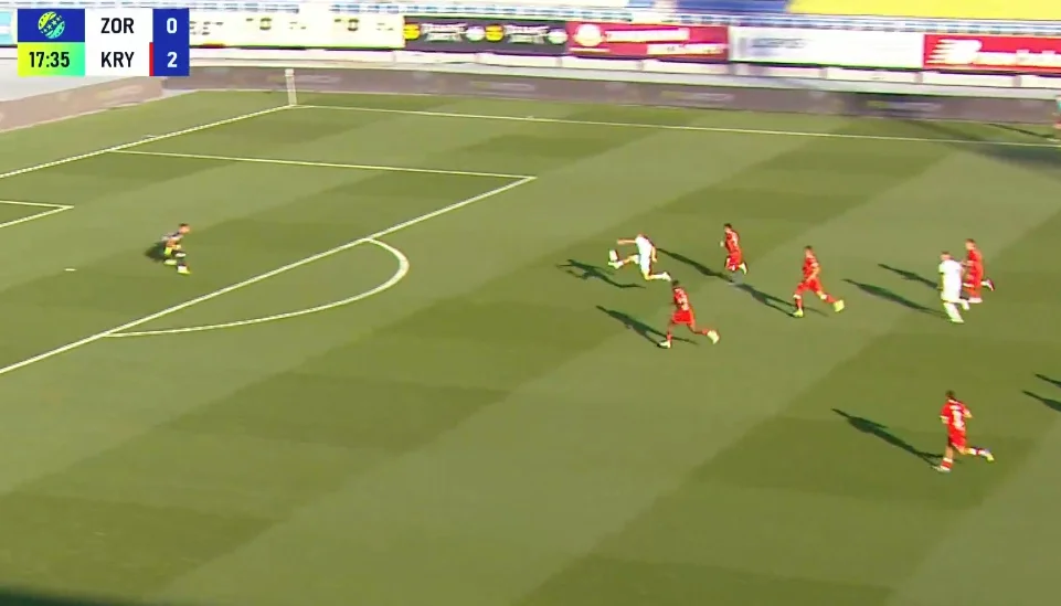 Ще через три хвилини Зоря могла влаштувати камбек. Мічін залишився без опіки на правому фланзі, отримав своєчасний пас і подав на лінію воротарського. Слесару залишилось тільки замкнути, однак Кемкін встиг зіграти на виході. Обидва зіткнулись у повітрі.