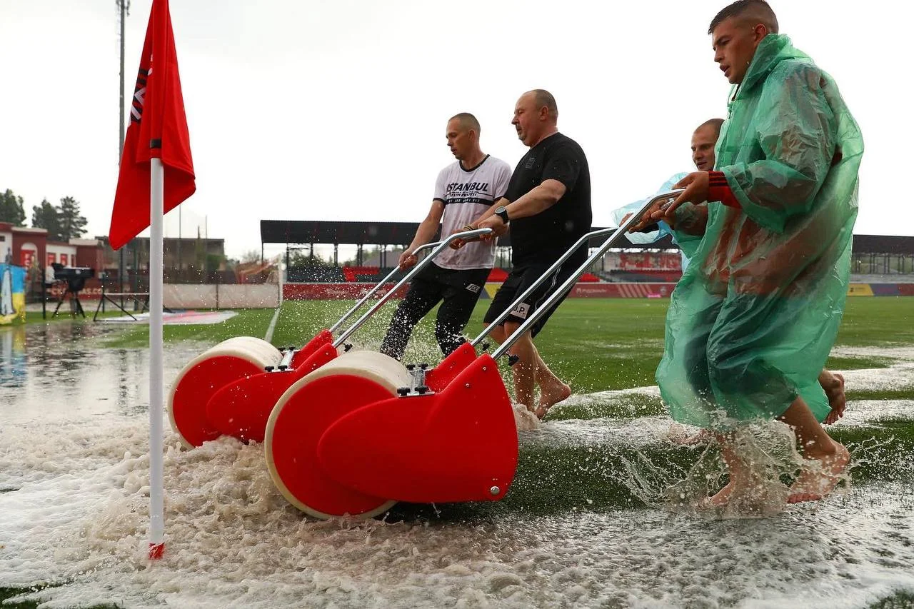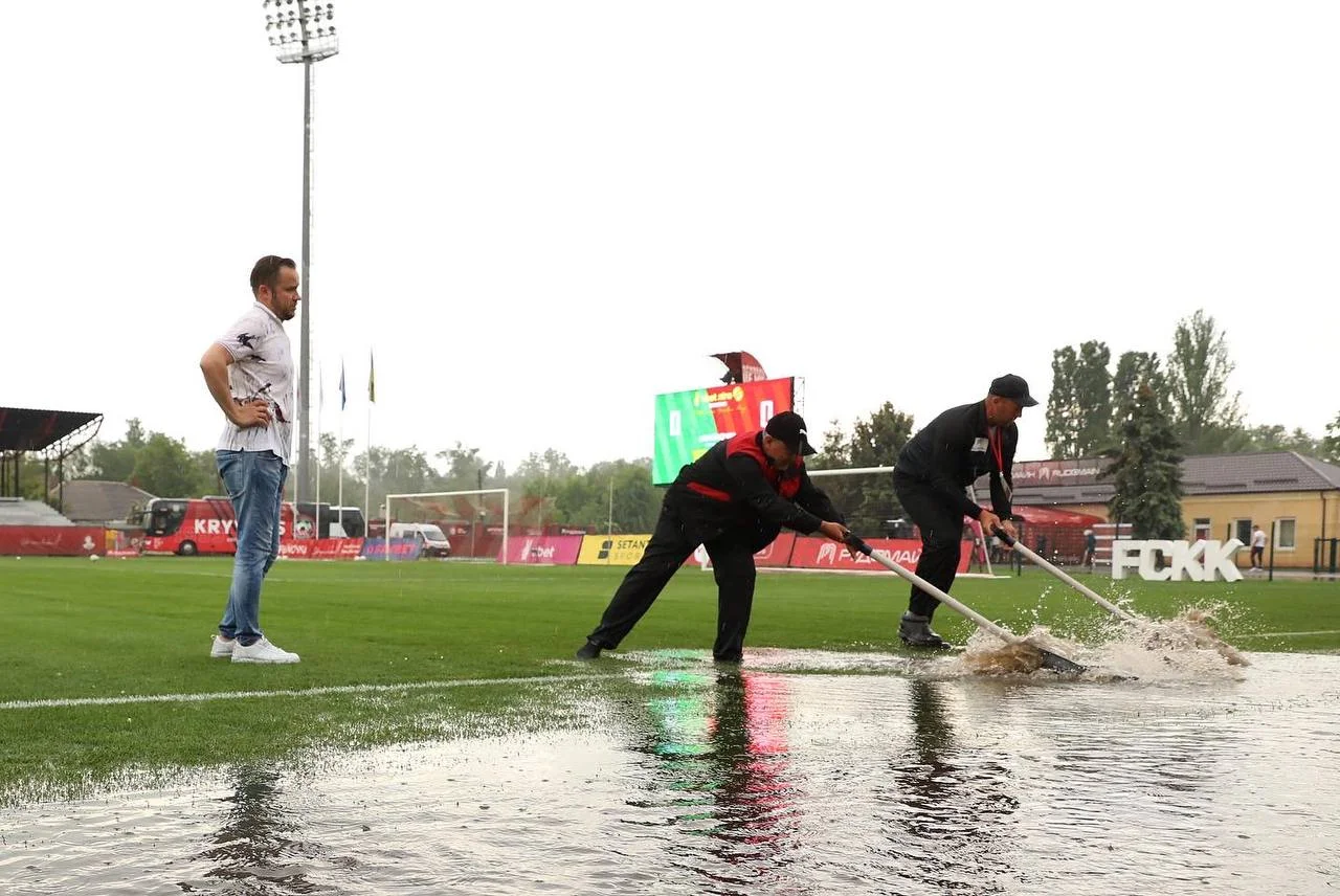 Стартовий свисток на стадіоні Гірник у Кривому Розі мав пролунати о 15:00, але у погоди були свої плани. Сильний дощ зробив газон непридатним для проведення футбольного матчу.