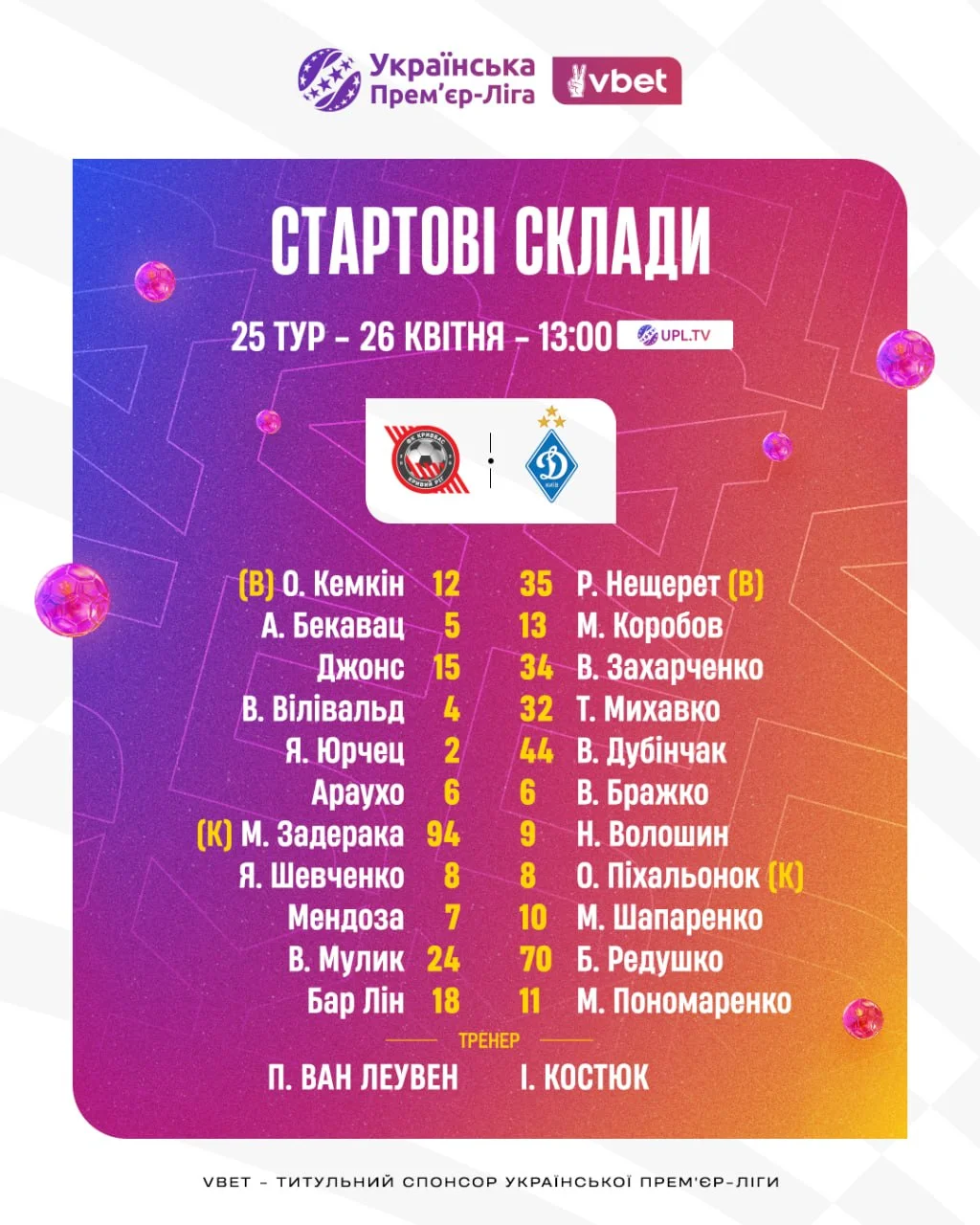 У 25 турі УПЛ Кривбас вдома прийматиме Динамо. Стартові склади команд і посилання на пряму трансляцію – в цій новині на "Футбол 24".