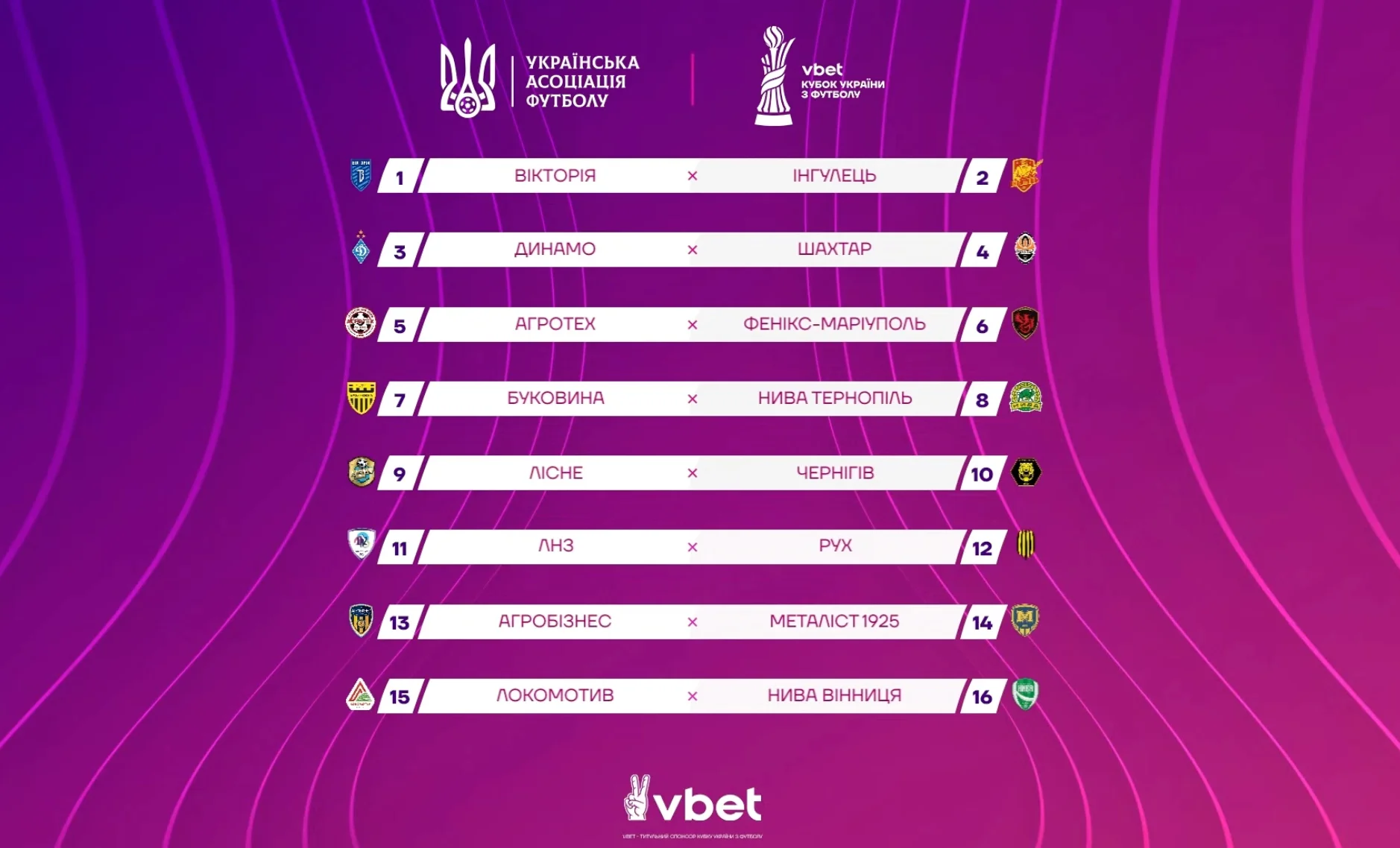 На цьому етапі турніру зіграють команди, які пройшли 1/16 фіналу. Серед учасників представлені клуби різних рівнів: від УПЛ – Динамо, Шахтар, Металіст 1925, Рух та ЛНЗ. Перша ліга – Вікторія, Фенікс-Маріуполь, Буковина, Нива Т, Агробізнес, Інгулець та Чернігів. А від Другої ліги виступлять Лісне, Нива В та Локомотив. Від аматорів – Агротех.