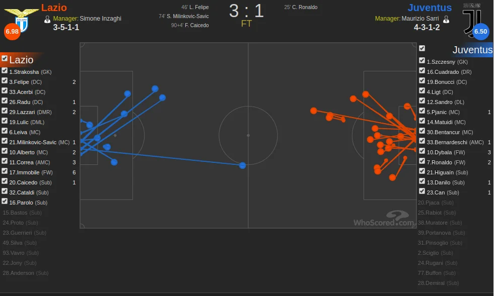 Роналду міг подвоювати перевагу під завісу тайму, але натомість Лаціо несподівано зрівняв – Луїс Альберто підтвердив свій статус кращого асистента й виконав подачу після розіграшу кутового на Луїса Феліпе, який перевисів усіх захисників та відправив "круглого" у ворота! 1:1 після першої половини.