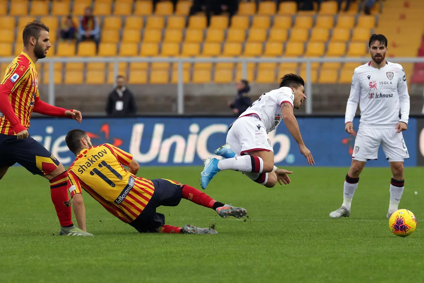 Завершальний недільний матч 13-го туру Серії А між Лечче та Кальярі мав пройти вчора, однак через складні погодні умови його перенесли на сьогодні. Дощ продовжував заливати газон, але не дуже сильно – втім, кліматичні покращення на користь футболу в першому таймі не пішли. За 45 з гаком хвилин команди завдали 7 ударів по воротах (майже всі – з дистанції), жоден з яких не ніс небезпеки. Наш Андрій Шахов, граючи зі старту, залишався непомітним, хоча це можна було сказати і про інших футболістів на полі.