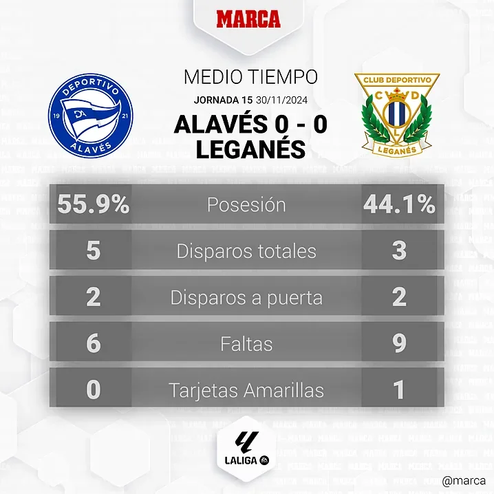 І Алавесу, і Леганесу важливо було взяти бали, щоб відірватися від зони вильоту. Господарі на перших хвилинах провели кілька хороших атак, але Дмітровіч діяв надійно. Відповів Леганес на 18 хвилині ударом Тапіа, Сівера парирував удар. Загалом у першому таймі команди створили не дуже багато моментів і на перерву пішли за рахунку 0:0.