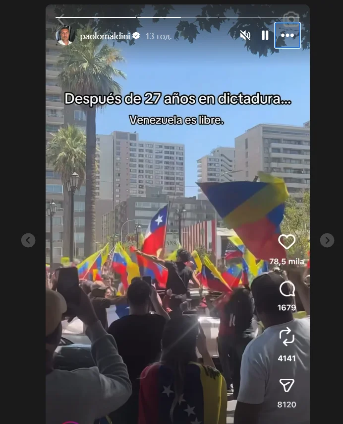 Колишній капітан "россонері" зробив репост відео, присвяченого затриманню президента Венесуели Ніколаса Мадуро в межах військової операції США. У відеоролику, яким поділився Мальдіні, містився напис: "Після 27 років диктатури... Венесуела вільна".