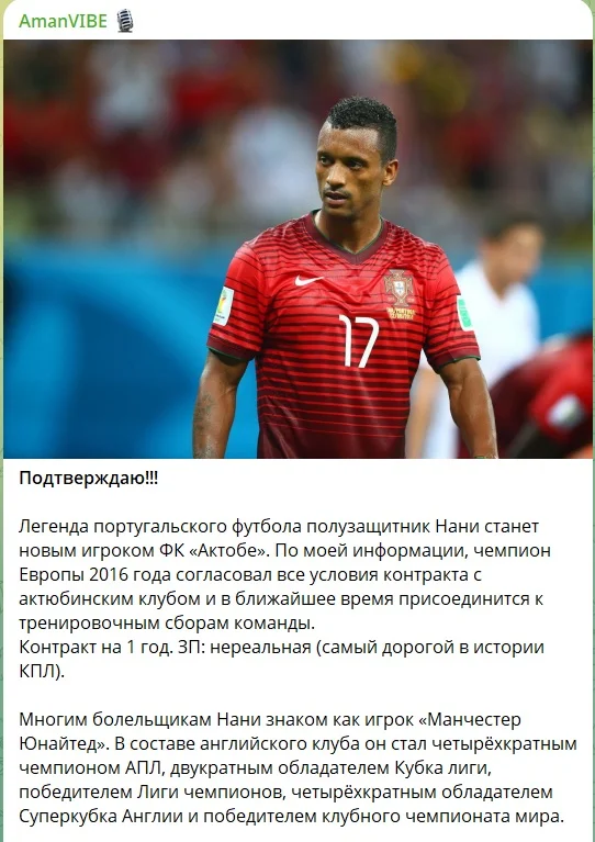 Іменитий португалець узгодив контракт з казахським Актобе, стверджує Telegram-канал ArmanVIBE. Нані запропонували угоду на один рік з "нереальною зарплатою" (найбільшою за всю історію чемпіонату Казахстану). Презентація очікується 22 січня.