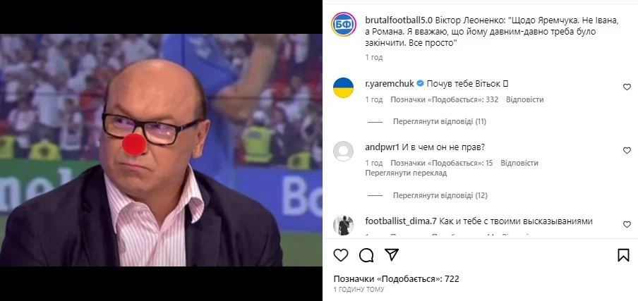 Яремчук відповів своєму критику в коментарях у пабліку Брутальний футбол в Instagram: "Почув тебе, Вітьок".