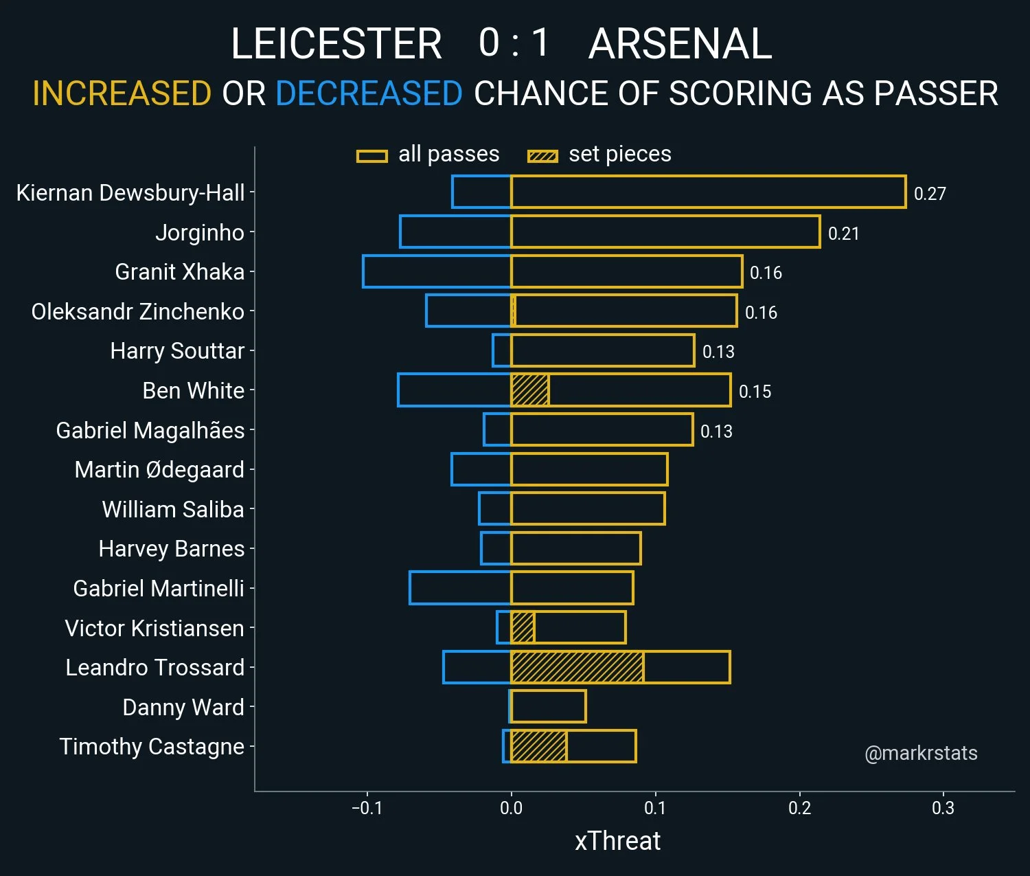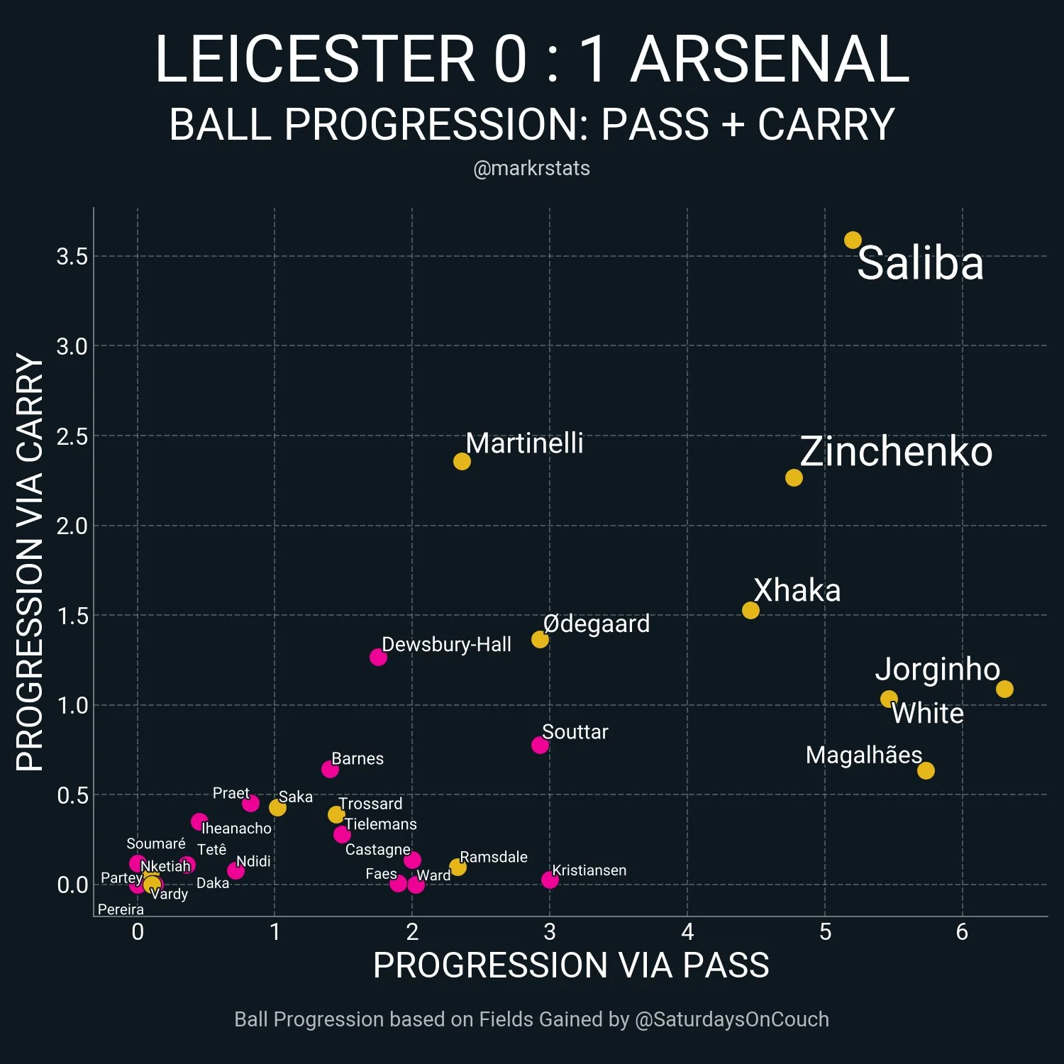 Зінченко – гравець матчу за версією FotMob (7,9). WhoScored (7,4) і SofaScore (7,4) помістили його вслід за Троссаром (7,5) на другу сходинку персонального статистичного рейтингу. Десь поруч захисний та атакувальні Габріели. Уся вісь лівого флангу сьогодні зіграла продуктивно та заслужила на найвищі оцінки. Туди ж зміщувався і Джака. Лестер з цим перевантаженням не впорався. До того ж, Арсенал засушив гру так, що суперник витиснув жалюгідний xG орієнтовно 0,1-0,2, найгірший показник в усій АПЛ щонайменше за 6 років. І це команда, яка пропускала 5 турів поспіль.