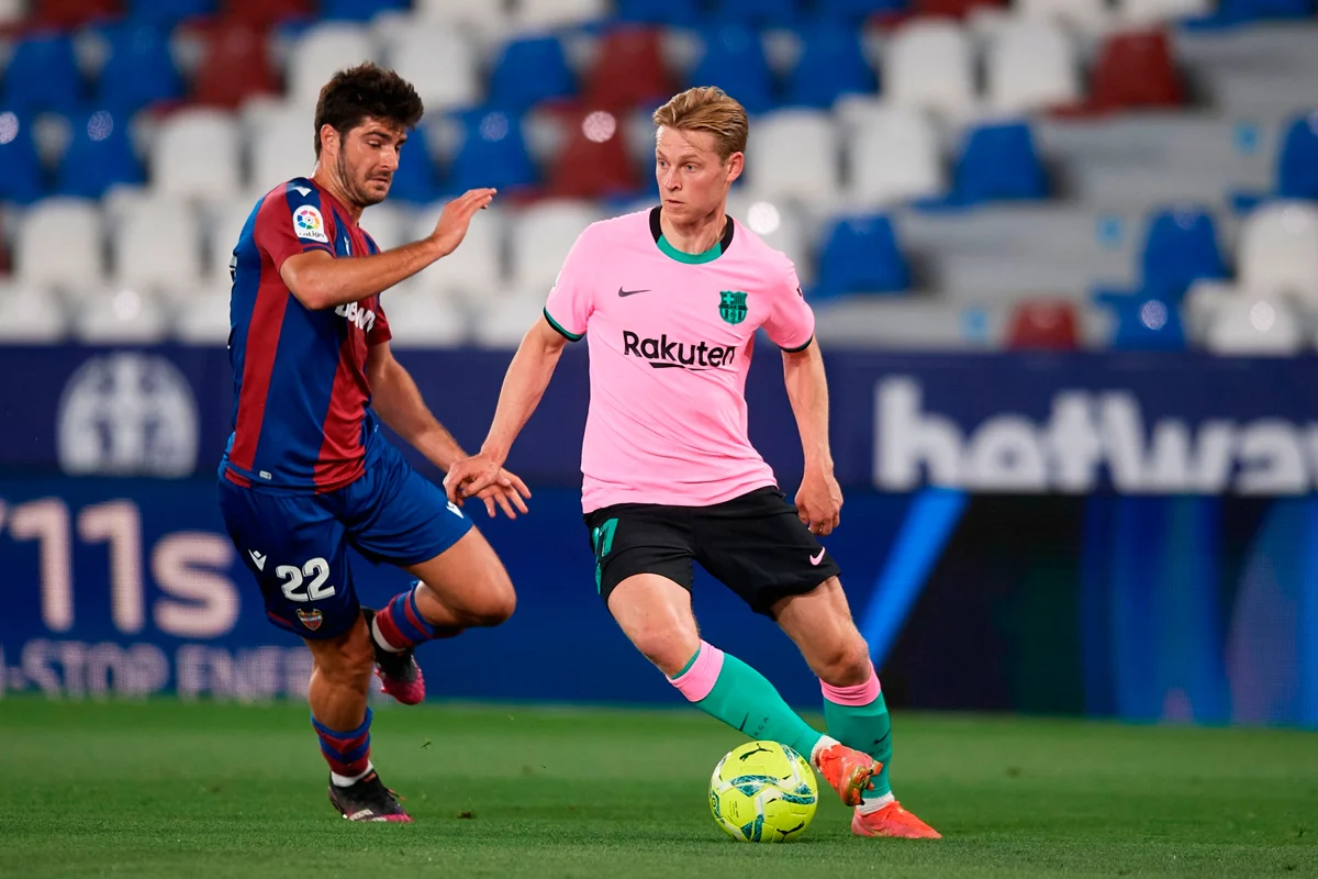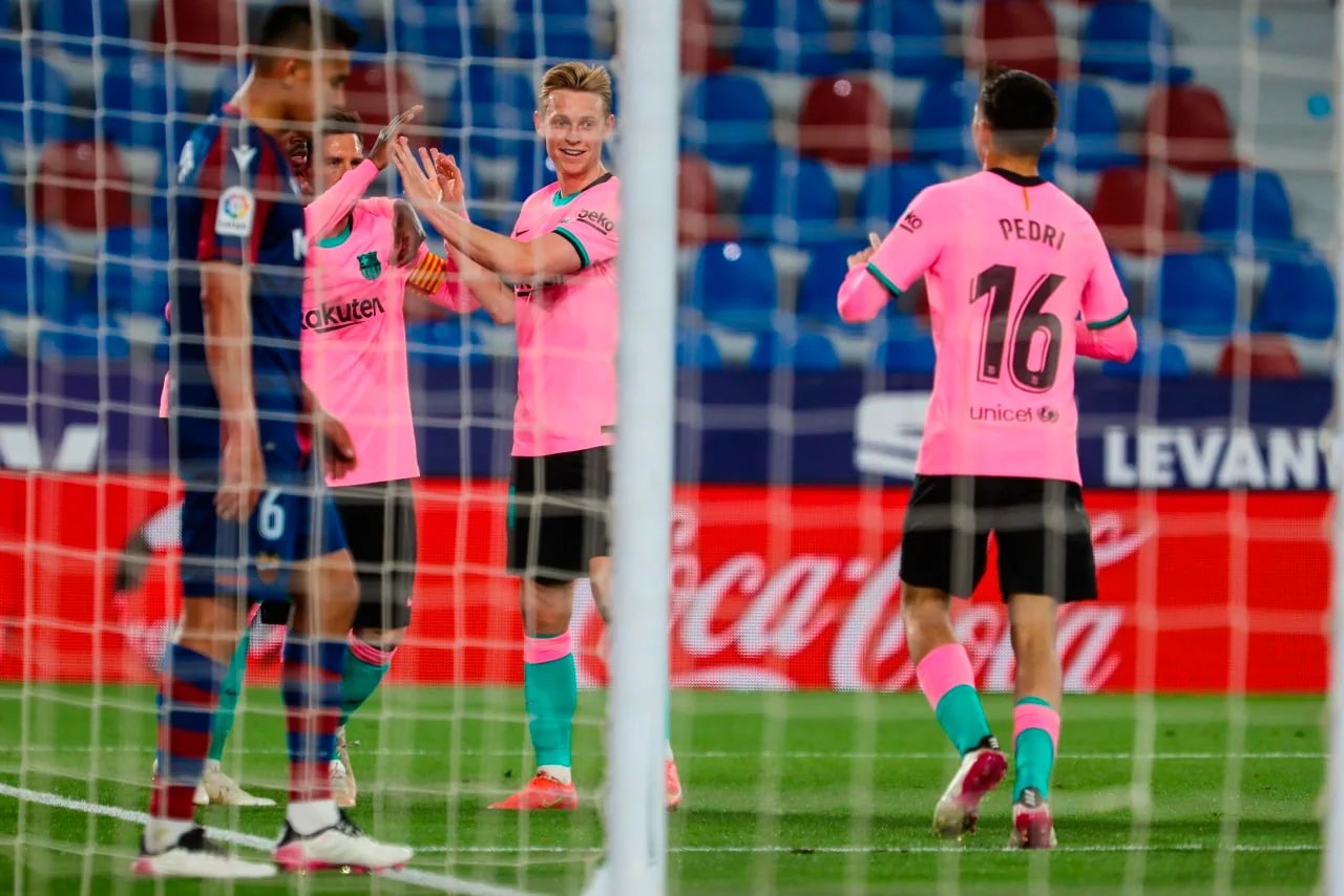Втім, у першому таймі від непоступливості Леванте не було й сліду. "Синьо-гранатові" домінували, в перші півгодини висипавши на господарів низку гольових моментів – дебютний стався вже на 2-й хвилині, коли Педрі метрів з десяти пробивав над поперечкою. Ще за три хвилини де Йонг увірвався на правий край штрафного, переграв Дуарте й витягнув на себе голкіпера, після чого віддав пас під замикання Педрі – втім, Айтор Фернандес встиг накрити його постріл!