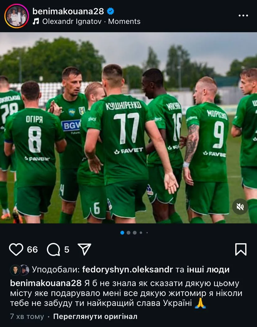 "Я б хотів сказати "Дякую" цьому місту, яке подарувало мені все. Дякую, Житомир! Я ніколи тебе не забуду. Ти найкращий. Слава Україні", – написав нападник у соціальній мережі.