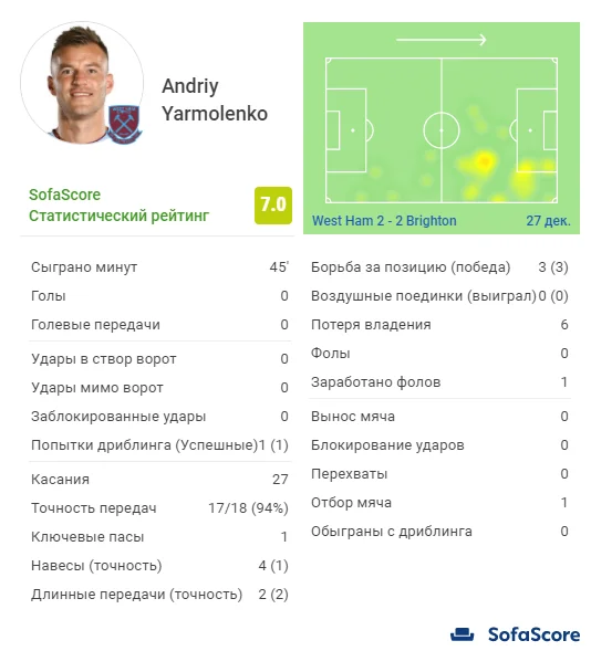 І господарям вдалося! Ярмоленко на 82-й хвилині відкрився між лініями й перевів м'яч на лівий фланг, Джонсон звідти виконав подачу, її вибили на кутовий, а навіс з нього замкнув Соучек – 2:2! Цей гол виявився останнім у зустрічі. Ярмоленко завершив її з 17 точними передачами з 18-ти, трьома переможними єдиноборствами (з трьох), одним вдалим обіграшем на дриблінгу (з однієї спроби) та шістьма втратами м'яча при 27 дотиках.