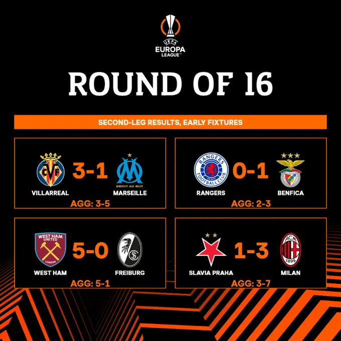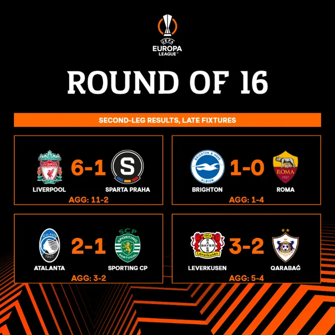 Стали відомі 8 команд, які продовжать боротьбу за трофей Ліги Європи. Найбільшою сенсацією ледь не став виліт Байєра, який після виїзної нічиєї вдома програвав Карабаху 0:2, але в доданий час забив двічі, вирвав перемогу та пройшов далі. Команда Хабі Алонсо продовжила феноменальну безпрограшну серію в сезоні 2023/24.
