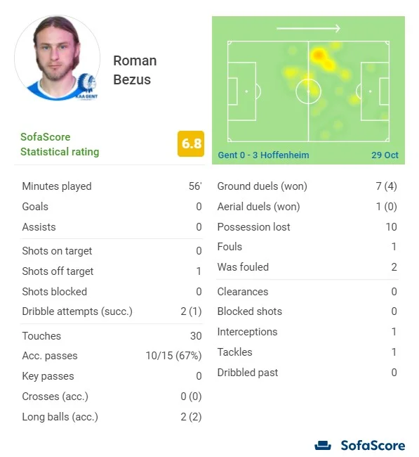 Хоффенхайм оговтався та розгромив бельгійців голами Бельфоділа, Грілліча, Гачіновіча та Даббура. Українці не дограли матч до кінця – у другому таймі Безус і Яремчук приєдналися до Пластуна в запасі Гента. Обидва провели слабкий матч, віддавши лише по 10 точних передач. В пасиві Яремчука – 5 офсайдів.