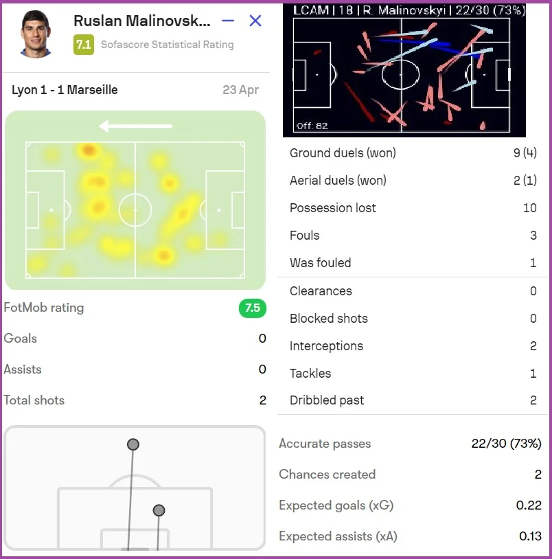 На 83 хвилині Маліновського замінили. На основі непоганих цифр, статистичні портали вивели Руслану пристойні оцінки: SofaScore – 7.1, FotMob – 7.5.