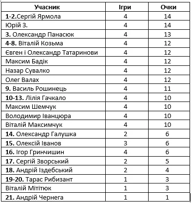 У турнірній таблиці зростає напруга. Бонусний ривок допоміг Юрію З. наздогнати лідера – Сергія Ярмолу – і тепер на вершині запанувало хитке двовладдя. На п’яти лідерам наступає Олександр Панасюк, а також група із шести учасників. Буде цікаво!
