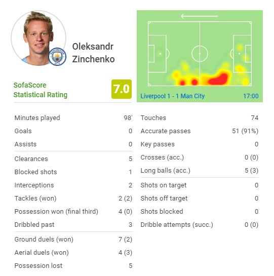 Десь до 60-ї хвилини за півзахисника збірної України було просто страшно. Однак Зінченко компенсував свої страждання відчайдушною грою в обороні. Найкращий зі всіх на полі за перехопленнями (2), другий після Отаменді за виносами (5). Поступився лише Родрі та Салаху в точності пасів (91,1%). Найчастіше серед гравців Сіті зустрічався з м'ячем (75). Невисокий зростом українець виграв 3 верхові дуелі. Більше тільки в Жезуса (4). Виконав 2 успішній підкати – лише в Робертсона 3. Віддав так званий передгольовий пас.