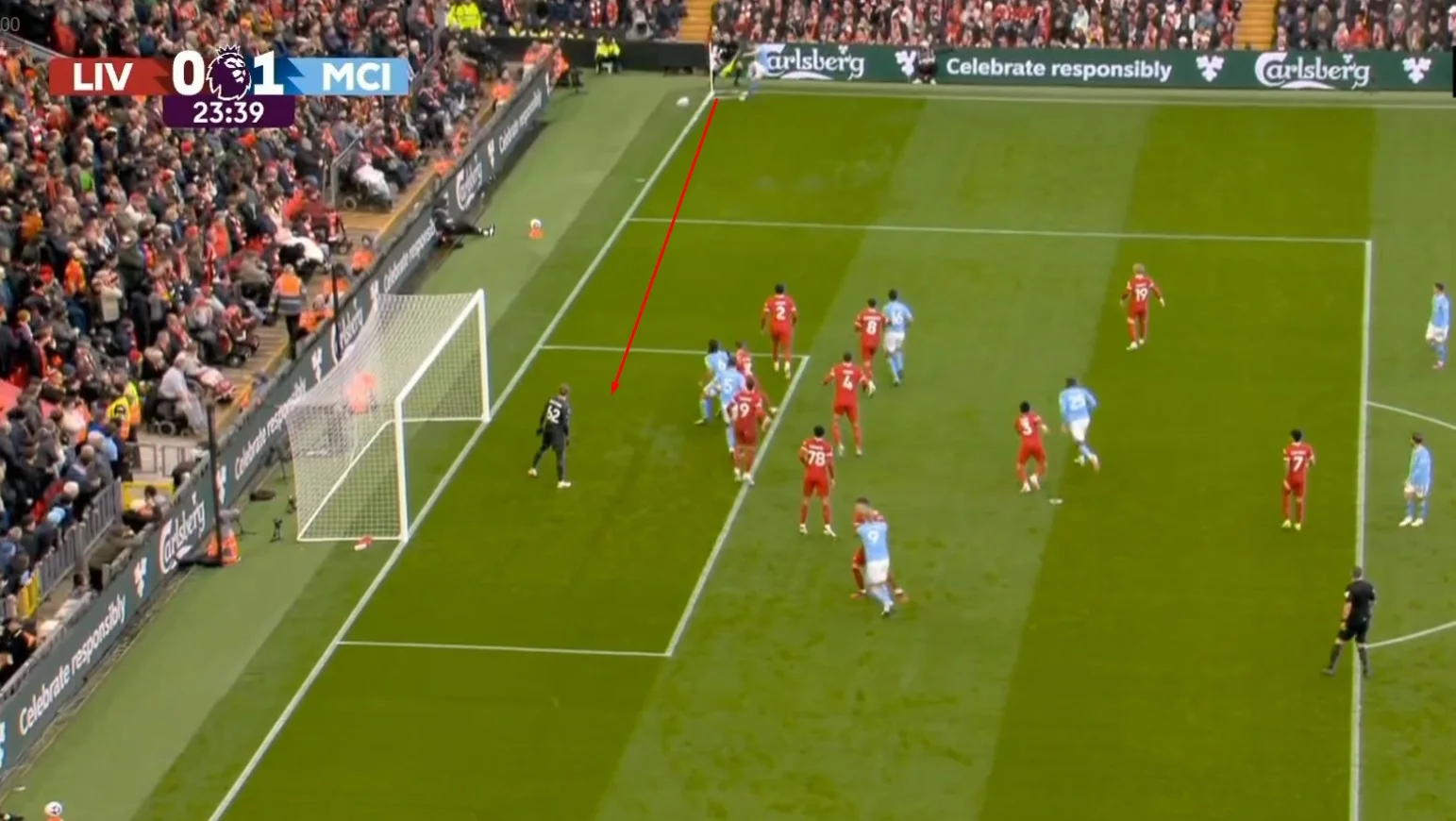 На початку другого тайму пресинг Ліверпуля призвів до гола. Аке поплив і віддав жахливий пас назад Едерсону. Бразилець не встигав до м'яча, тому збив у власному штрафному Дарвіна. Мак Аллістер реалізував пенальті та зрівняв рахунок.
