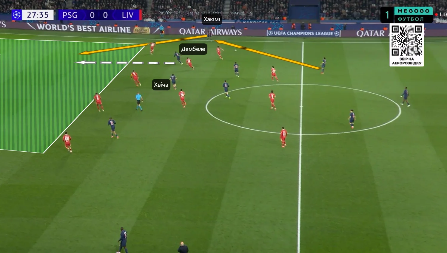 Парижани в цілому не здивували тактичною моделлю, адже команда вельми догматична. Господарі вибудовувались у схему 3-2-5 на стаді розвитку атаки, причому вся передня п'ятірка активно обмінювалась позиціями й ролями. Дембеле, Барколя й Хвіча блукала по різних флангах чи напівфлангах – граючи як вінгерів, так і фальшивих дев'яток. На позиції форварда міг опинитись і центрхав Фабіан Руїс.