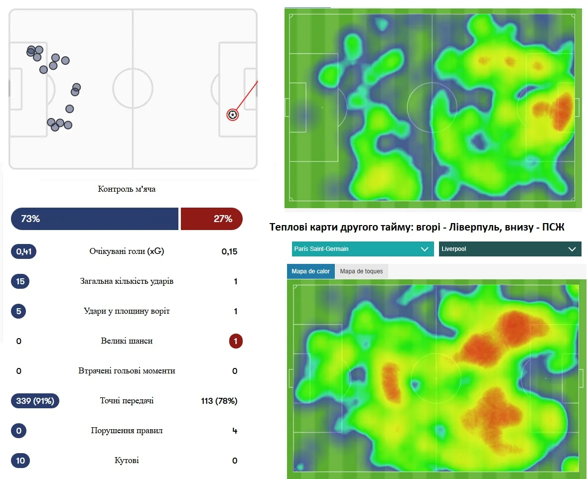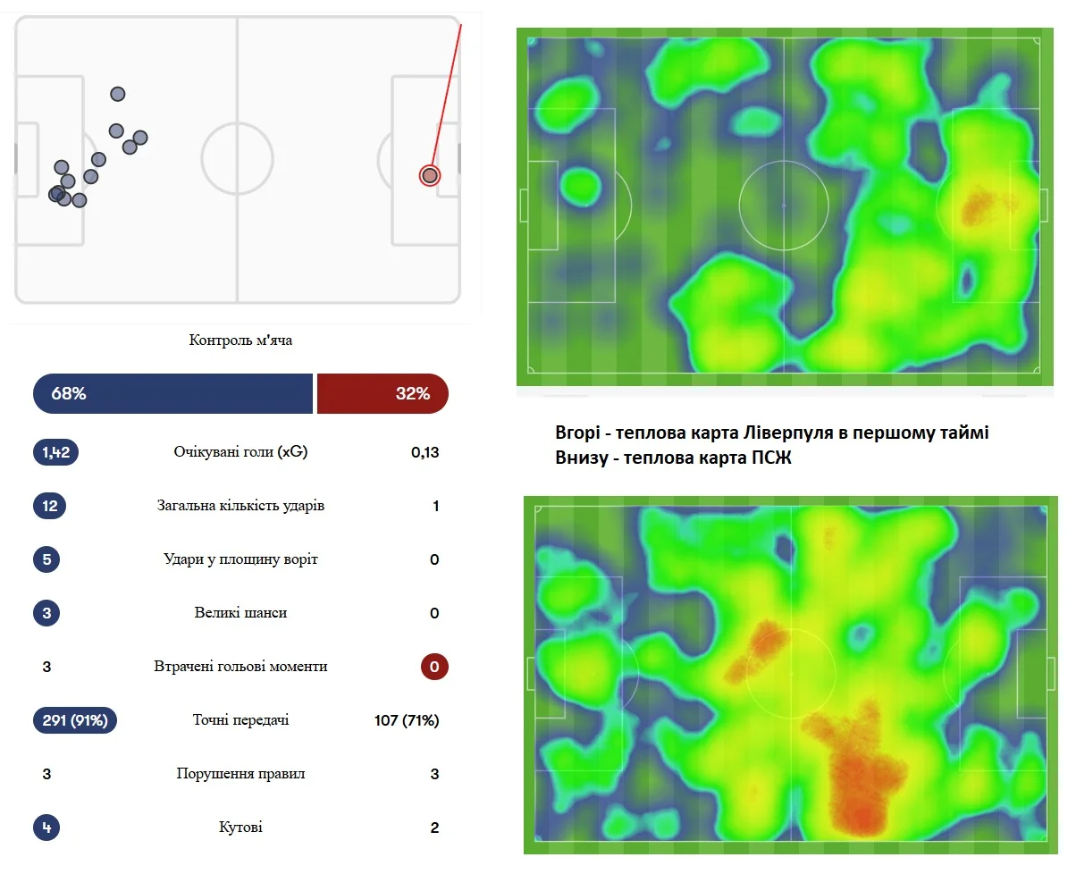 Наслідком тактичного провалу Арне Слота стала статистична катастрофа. ПСЖ володів м'ячем 68% часу, а за ударами виграв перший тайм з рахунком 12:1, награвши на 1,42 xG. І це без урахування скасованого гола Кварацхелії.