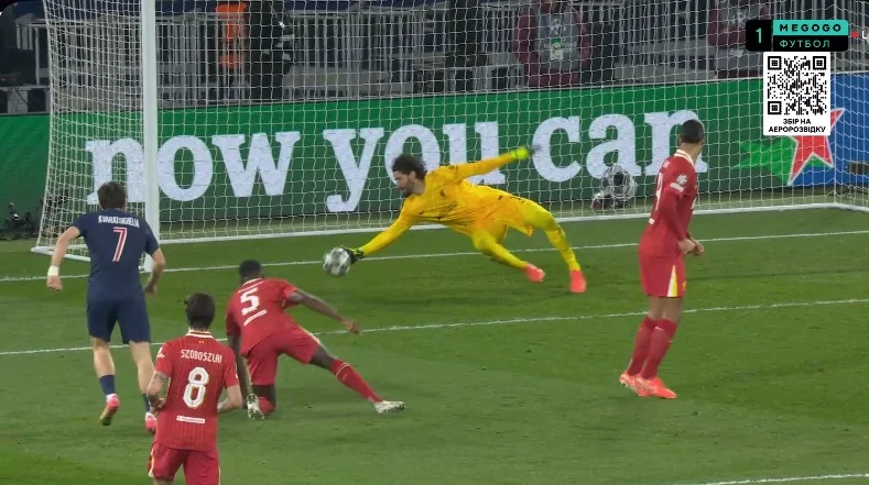 На 28-й хвилині Кварацхелія створив 2-в-1 проти Макаллістера, прийняв пас від Барколя й вистрілив з дальньої дистанції у все той же лівий нижній кут. Аліссон врятував і тут.