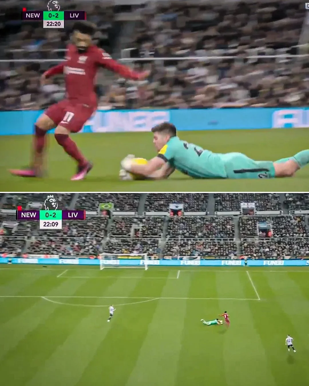 На старті другої половини Ісак і Шер не реалізували вигідні моменти. Сен-Максімен продовжував накручувати ліверпульців пачками. Тривожний епізод стався з Дарвіном. Невдало приземлився уругваєць у боротьбі з Тріп'єром на газон, травмувавши плече. Клопп зробив відразу 4 заміни на 59 хвилині. Пошкодження Нуньєса виявилося доволі серйозним. хоча Дарвін ще встиг перед виходом увійти до штрафного і пробити в дальній – Дубравка виручив. І знову розкішні трієчки Ліверпуля. Починають розривати гості на контратаках то ліворуч, то праворуч. Елегантна гра в пас виводить Робертсона сам на сам, але шотландський захисник вирішує покотити на Салаха – в недодачу.