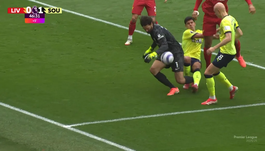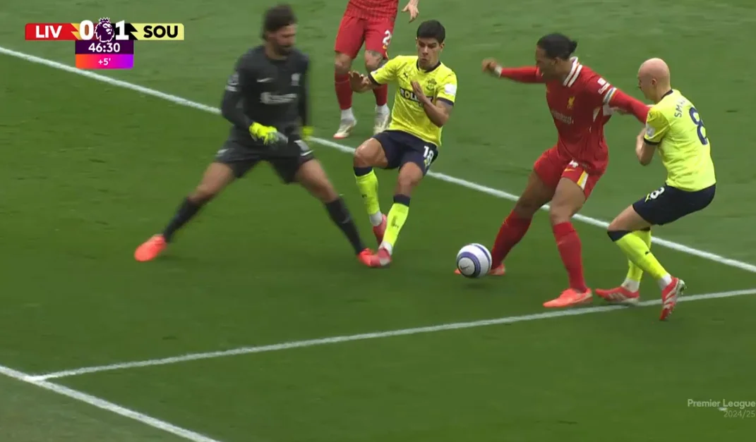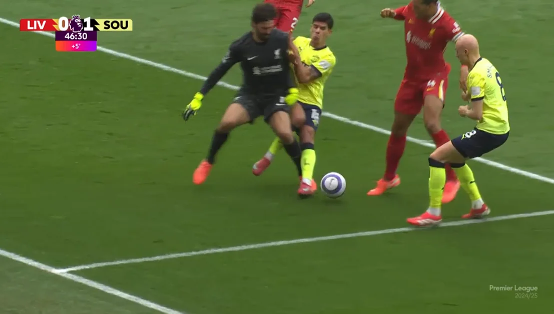 Саутгемптон забив доволі сумнівний гол. Після вкидання з ауту Смоллбоун увірвався в штрафний, але його прохід контролював ван Дейк – Аліссон же був першим на м'ячі. І тут між захисником і голкіпером несподівано постав Фернандеш! Матеуш помітно наступив на ногу Аліссону, після чого стався контакт з падінням останнього.