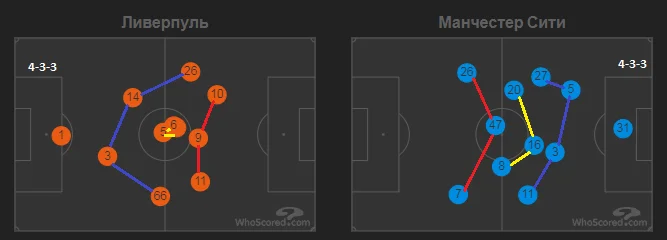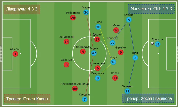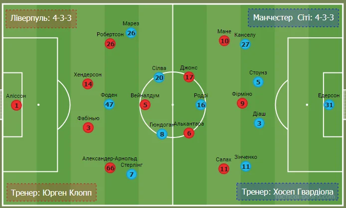 Стартові склади команд були достатньо прогнозованими. У обох тренерів існували варіанти на різні позиції, але обійшлося без великих кадрових та тактичних несподіванок. Обидві команди грали за базовою схемою 4-3-3. До хавбеків у центрі оборони Ліверпуля усі давно звикли, а у Сіті вже не вперше роль хибної дев'ятки виконував Фоден, який провів один із кращих, а можливо і найкращий свій матч у професіональному футболі.