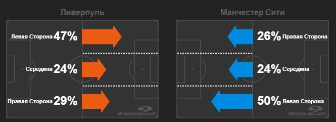 Александер-Арнольд і Робертсон тримали ширину позиційних атак і насипали кроси (загальнокомандний рахунок – 21:6), тоді як Канселу і Зінченко більше були заточені на оборону, португалець взагалі у фазі гри з м'ячем зміщувався на позицію опорника і підтримував атаки своєї команди переважно у правому півпросторі.