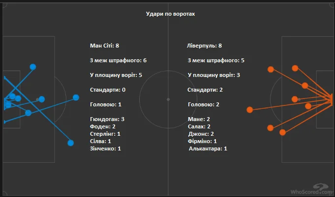 Не дивлячись на рівність за кількістю ударів, моменти гостей були значно гострішими, а багато з них не мали логічного завершення. Та навіть восьми ударів по воротах вистачило, щоб мати величезну перевагу у показниках очікуваних голів – 1,18:3,55. Навіть якби не було індивідуальних помилок Аліссона, Ліверпуль не заслуговував на прийнятний для себе результат.