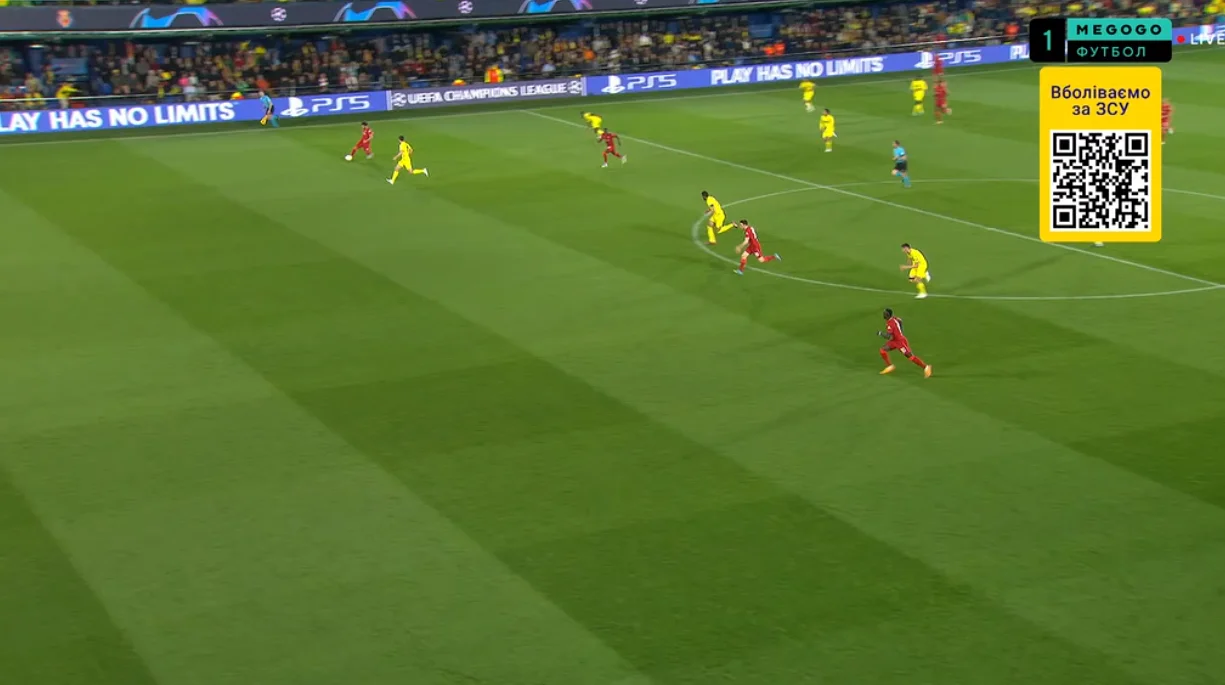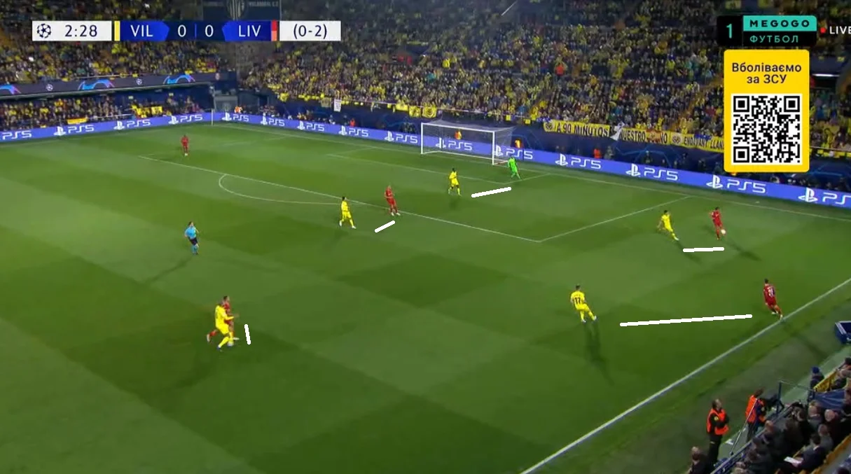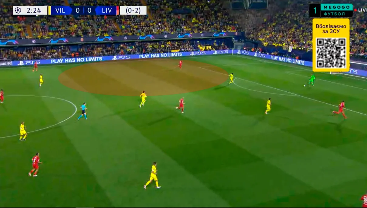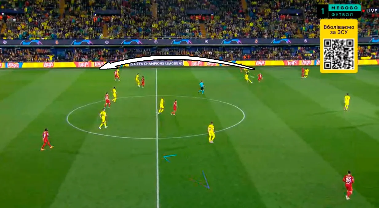 Вільяреал віддав ініціативу й дозволив спокійно розігрувати м'яч у першій фазі білд-апу. Мерсисайдці зуміли підняти голову й почали розкатувати свої класичні ходи – обмін позиціями між фулбеком, вінгером і центрхавом, зміщення опорників на фланги, виконувати діагоналі, перевантажувати зони через зміщення флангових гравців у центр чи на протилежний край, тощо. Трійка центральних хавбеків Ліверпуля просто розквітнула, легко відкриваючись і розганяючи атаки.