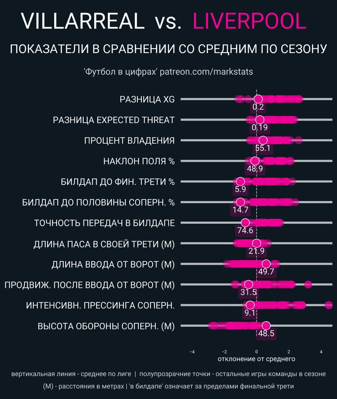 Як наслідок, Ліверпуль у першому таймі тотально провалився в структурному плані. Точність передач в білд-апі мерсисайдців виявилась на 11% нижчою за середній показник по сезону, а просування після розіграшу від воріт було на 20 метрів коротшим. Підопічні Юргена Клоппа за таких умов провели всього 2 удари з мізерним xG, а точність пасів загалом опустилася до рівня 66% (антирекорд за останні два роки).