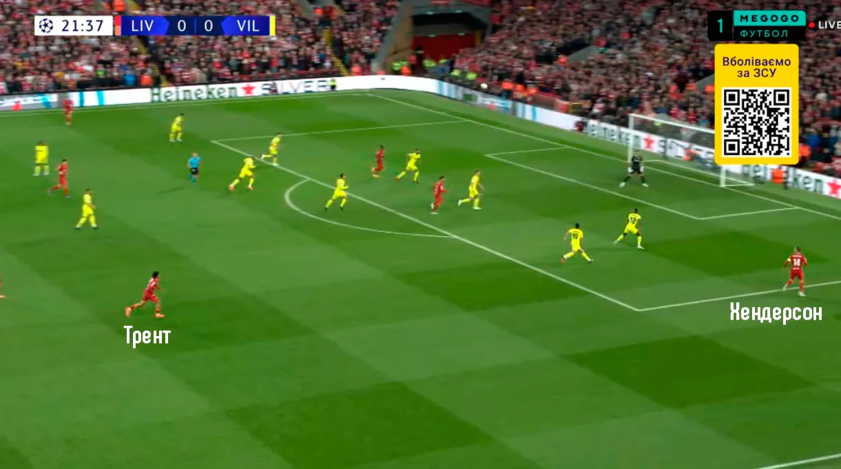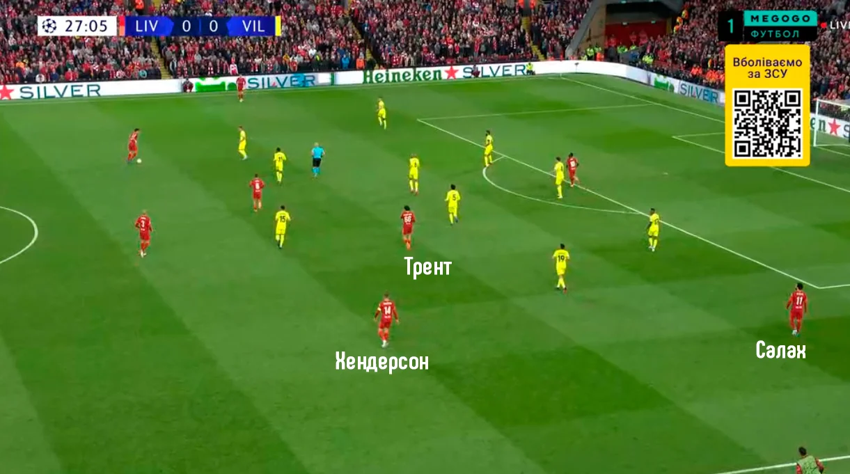 Трент або зміщувався в центр, відкриваючи простір для ривків Салаха, або ж сам залишався у широкій позиції – тоді господарі витягували блок Вільяреала на один фланг і різко виконували діагональ на відкритого ТАА. Коли це почало приносити успіх, іспанці почали сідати глибше, вибудовуючи лінію в 6-7 захисників. Таким чином "жовта субмарина" не дозволяла себе розтягувати, однак тоді відкривався простір у центрі.