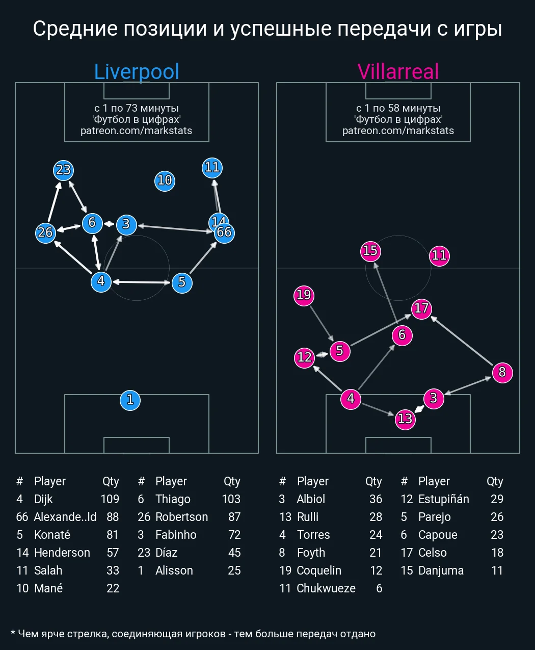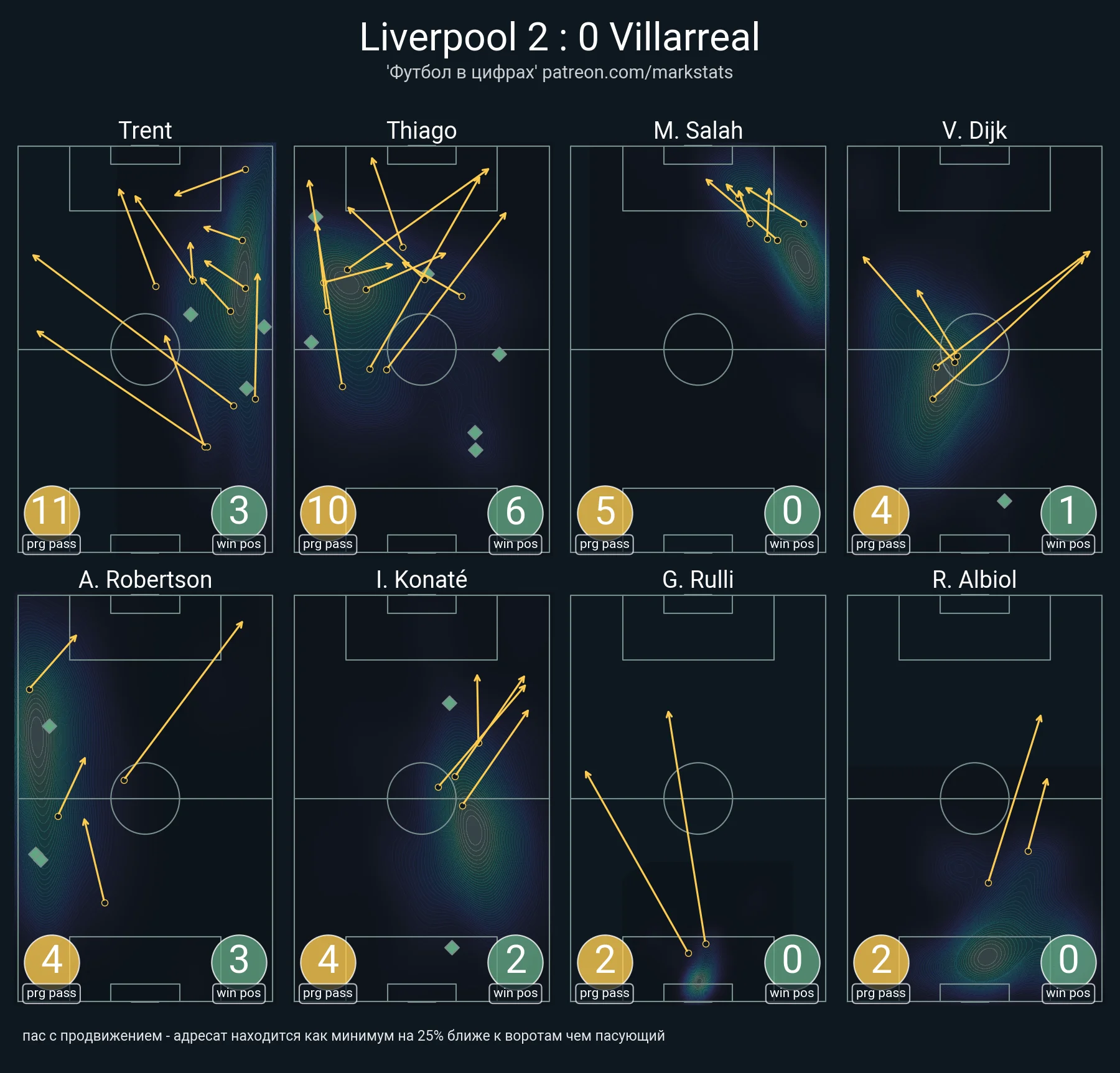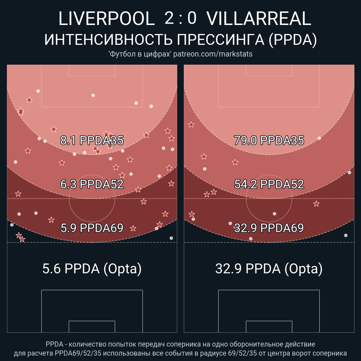 Ліверпуль провів 25 просувань м'яча у штрафний (15 через паси, 8 через дриблінг), довів володіння до 73% і видав просто інфернальні показники пресингу в кожній із третин чужої половини поля. Це вилилось у 19 ударів проти 1 у Вільяреала.