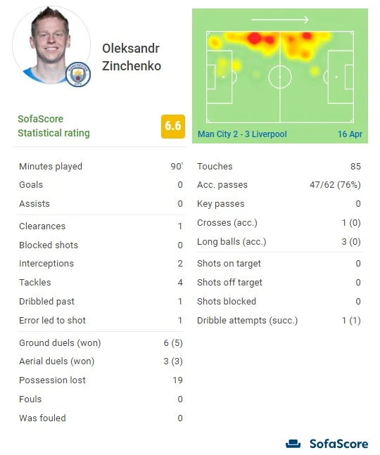 Український універсал з'явився у старті вперше з 9 березня, але не зумів вразити у протистоянні з серйозним суперником. Так, Зінченко кілька разів вдало зіграв у відборах та на перехопленнях, але цього виявилося занадто мало. Водночас Олександр припустився кількох серйозних помилок – не встиг за Мане, коли той забивав третій гол, а також невиправдано ризикував у другому таймі, коли ледь не відзначився Салах.