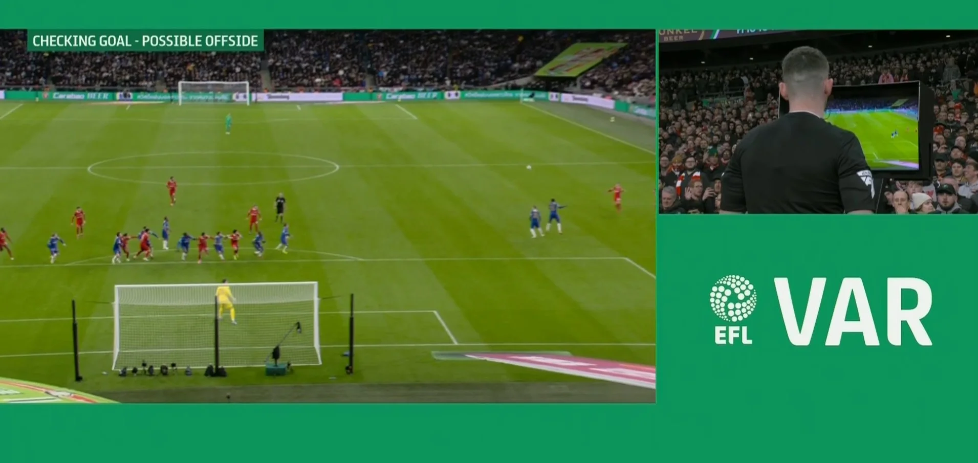 Згодом судді віддали борг і також неочевидно скасували гол Ліверпуля. Подача зі штрафного, Ендо з офсайда починає рух від воріт і блокує Колвіла. Ван Дейк, користуючись нейтралізацією суперника, головою забиває. Арбітр після перегляду VAR зафіксував положення поза грою.